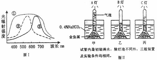 5.现有A、B、C三种灯泡,其发出光波的波长与光辐射强度的关系如下图1所示,现需从中选择一种灯泡用于温室中给植物补光,期望最大限度地增加光合作用的强度。为此某同学设计了图II所示的实验装置。已知:叶绿体中的色素主要吸收430-450nm的蓝紫光和640-660nm的红橙光,那么根据图II实验现象推断A、B、C三种灯泡与图I中三条曲线之间的对应关系及温室中应选择的灯泡种类分别是