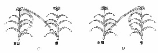 (2)请预测该实验中F2的预期值 (3)根据甲、乙两组同学的实验结果,从上图中选出两组同学在用亲本杂交时的授粉过程(用图中字母表示)。甲组: ,乙组 (4)如果按甲组的杂交方法不改进,后续实验要如何进行才能得到正确的性状分离比? ;如果对甲组的实验进行改进,其措施是:用牛皮纸袋将玉米的 分别套住并固定,防止自然受粉过程。 (5)新采摘的甜玉米果穗具有甜味,但放一段时间后甜味便降低。如果采摘后放在沸水中浸泡一段时间后再保存,甜味能保存较长一段时间;如果采摘后放在35℃ 一40℃的温度下,甜味消失得更快;如果采摘后马上放入冰箱中冷藏,也可以使甜味的保持时间延长。请回答:① 新采摘的甜玉米放一段时间后,甜味降低的原因是 ② 后面的沸水中浸泡、35℃ 一40℃的温度处理以及放入冰箱中冷藏等实验证明