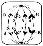 已知玉米(2N:20),高秆、易倒伏(D)对矮秆、抗倒伏(d)为显性,抗病(R)对易感病(r)为显性,控制上述两对性状的基因分别位于两对同源染色体上。现有两个纯合的玉米品种甲(DDRR)和乙(ddrr)杂交得F1。右图为F1代植株一个正在分裂细胞的部分染色体(即与上述两对基因有关的染色体)组成,下列有关叙述错误的是