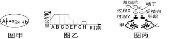如图甲为某夫妇含有AaBb 两对等位基因的一个体细胞示意图,图乙为某细胞分裂过程中DNA 含量变化曲线图,图丙为该妇女在一次生殖过程中生出男孩甲和女孩乙的示意图。下列有关叙述错误的是