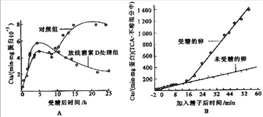实验二:将未受精的海胆卵和受精的海胆卵分别悬浮在含有14C-亮氨酸的条件下进行培养(0时间表示受精的时刻),定时测定细胞中放射性亮氨酸的掺入累积量,得到的实验结果绘制成的曲线如图B。