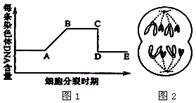 22.右图1表示细胞分裂的不同时期与每条染色体DNA含量变化的关系,图2表示处于细胞有丝分裂某个时期的细胞图像。下列说法中正确的是 ( )