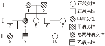 38(8分).下图是具有两种遗传病的家族系谱图,设甲病显性基因为A,隐性基因为a;乙病显性基因为B,隐性基因为b。若Ⅱ-7为纯合体,请据图回答: