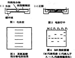 A1.(8分)PCR技术是把某一DNA片段在体外酶的作用下,合成许多相同片段的一种方法,利用它能快速而特异的扩增任何要求的目的基因或DNA分子片段;电泳技术则是在外电场作用下,利用分子携带的净电荷不同,把待测分子的混合物放在一定的介质(如琼脂糖凝胶)中进行分离和分析的实验技术,利用它可分离氨基酸、多肽、蛋白质、核苷酸、核酸等物质和作亲子鉴定。右图是电泳装置及相应电泳结果。