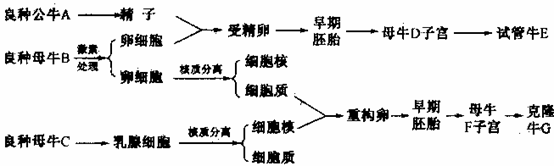 (1)在试管牛E和克隆牛G的培育过程中都必须用到的两项技术是动物细胞培养和