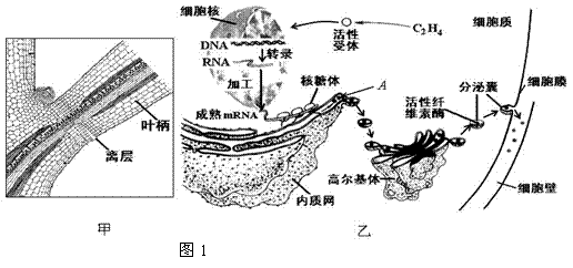28、(10分)秋末植物的叶片衰老时,在叶柄基部开始形成离层(如图1甲所示),而后从植物体上脱落。离层部位细胞相关的生命活动如图乙所示。请据图回答下列问题: