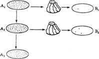 步骤3:用灭菌后的丝绒包上棉花制成的一枚“印章”,在A1上轻轻盖一下,再在B1上轻轻盖一下,这样A1中的细胞就按一定的位置准确地“复制”到了B1之中。将B1培养一段时间后,B1中一定部位出现了少量菌落。