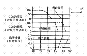 18.为了研究A和B两个植物物种对热压的反应,科学家将这两种植物的叶片以不同的温度处理,然后测定其光合作用和呼吸作用的速率,以及叶片的离子渗漏情况。对照实验则在30℃进行。研究结果如下图所示: