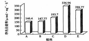 20.紫菜(Porphyra)是中国重要栽培经济海藻之一。国内研究人员以条斑紫菜为材料,对其光合作用与温度等因素进行研究,探索育种生理指标,旨在为筛选高产量、耐高温优良紫菜品种提供理论依据。实验中HA、HB、HD三个株系是由同一株条斑紫菜单细胞克隆获得。表1为不同温度对不同紫菜株系丝状体光合作用的影响;图1为条斑紫菜养殖群落中随机取5株生长状况相同的条斑紫菜,编号为A、B、C、D、E,在15℃、27000Lx条件下测得的净光合速率(净光合速率=![]()