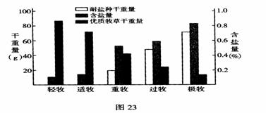 23.松嫩平原位于我国东北地区的中心,近年来,由于多种原因导致草原退化,优质牧草大量减少。为了提示该草原退化的原因,科学工作者作了大量的研究。图23表示优质牧草干重、土壤含盐量与草原放牧程度的关系。