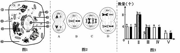 43.图1是高等动物细胞亚显微结构模式图,图2是某一生物体中不同细胞的分裂示意图,图3示图2生物细胞分裂过程中不同时期细胞内染色体、染色单体和DNA含量的关系。请据图回答问题: