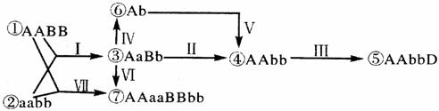 13. [资阳08-09一模](5分)下图是用农作物①和②两个品种分别培育出④、⑤、⑥、⑦ 三个品种的过程,A、a和B、b、D为基因,且A、a和B、b位于非同源染色体上.