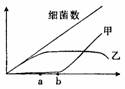 16.用基本培养基对某种细菌进行培养,定时测试细胞数目,并在a、b两点分别加入2种营养物质,甲和乙是细胞中两种酶的含量变化曲线,如右图所示。以下判断不正确的是