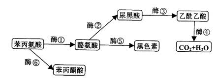 ( 1 )下图是苯丙氨酸代谢途径示意图,根据该图有人认为缺乏酶 ① 会同时患苯丙酮尿症、白化病和黑尿症,你认为正确吗?请说明理由。________________________________。