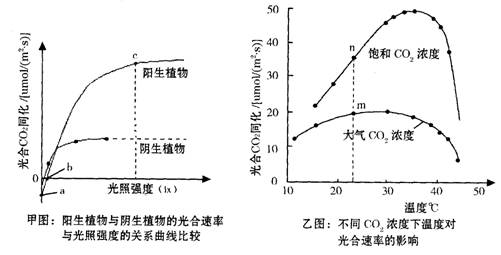 ( 4 )如在乙图的 n 点条件下测得阳生植物光照强度与光合 CO2同化速率关系曲线,则该曲线与甲图的阳生植物曲线比较 b 、 c 点的移动情况是__________________________