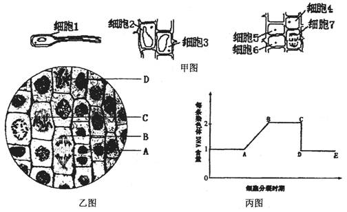 30.Ⅰ:某同学在显微镜下观察洋葱根尖细胞的装片时,在低倍镜下观察到甲图的细胞,在高倍镜中看到乙图中所示的视野;丙图是该同学根据细胞分裂中染色体变化的过程而绘制的每条染色体中DNA含量变化的坐标图。