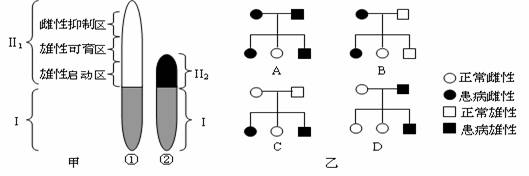 (1)分析甲图,位于Ⅱ1片段上的某基因所控制性状的遗传最可能与乙图的 (填编号)相符,其遗传特点是 。