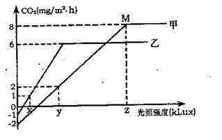4.右图表示甲、乙两种植物随着光照强度的变化,CO2吸收量或CO2释放量的变化曲线图。据图分析下列叙述不正确的是 ( )