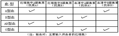 人体中的血型有A型(基因型:IAIA或IAi)、B型(基因型:IBIB或IBi)、AB型(基因型:IAIB)和O型(基因型:ii),人体血液中含有红细胞(内含相应的抗原)和血清(内含相应的抗体),其抗原、抗体的情况如下表所示,据表分析,下列说法中错误的是