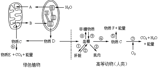 21、(7分)下图代表绿色植物和高等动物(人类)代谢的部分过程示意图。请据图回答: