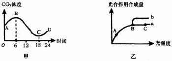 (7分)右图甲中曲线表示春季晴天某密闭大棚内一昼夜CO2浓度的变化。乙图曲线a表示某种植物在20℃、CO2浓度为0.03%的环境中随着光照强度的变化光合作用合成量的变化;在B点