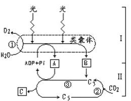 ㈠。上左图是绿色植物所进行的某种活动,分析并回答:(1)图中字母A、B、C各自所代表的物质名称是:A: ,B: 。