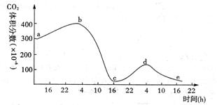 (4)北方农村常建造塑料薄膜温室在冬季栽培蔬菜。某温室从下午4点开始持续密封48小时,测得温室内CO2体积分数的变化情况如下图所示。试分析:曲线b-c段大幅度下降的原因是 ;C~d段的成因是 。检测结果表明,要提高温室作物的产量必须适时通风,你认为通风的时间应选在曲线 区段对应的时间进行。