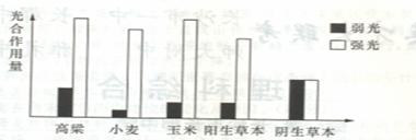 30、在适宜的温度、水分和CO2条件下,分别测定强光和弱光时不同植物的光合作用量如下图所示,请据此判断,下列叙述不正确的是 ( )