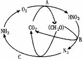 下图是生态系统中碳循环和氮循环的一部分,A、B、C三类微生物参与其中,下列说法错误的是