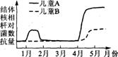 结核病是由结核杆菌引起的一种肺部传染病,结核杆菌可以通过空气或痰液传播。儿童接种BCG疫苗,可以有效预防结核病。现有A、B两个儿童,儿童A在1月份接种了BCG疫苗,儿童B没有接种,两人均在4月份感染了结核杆菌,下图表示A、B两个儿童在1到4月血浆中结核杆菌抗体的数量。
