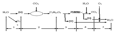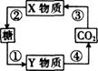 (1)X、Y物质分别代表三碳化合物和丙酮酸 (2)①、④过程消耗[H],②过程产生[H] (3)①过程发生在线粒体基质中,②过程发生在叶绿体基质中(4)①、②、③、④四个过程中既没有消耗氧气,也没有产生氧气