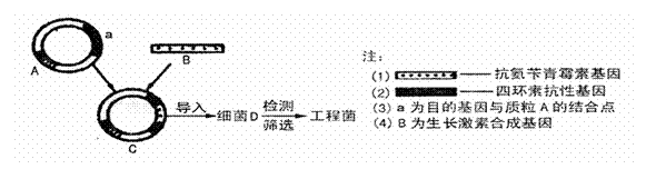 下图是将人的生长激素基因导入细菌D细胞内,产生“工程菌”的示意图。所用的运载体为质粒A.若已知细菌D细胞内不含质粒A,也不含质粒A上的基因,质粒A导入细菌D后,其上的基因能得到表达。能表明目的基因已与运载体结合,并被导入受体细胞的结果是: