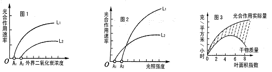 18.下面图1.图2.和图3分别表示玉米和大豆的光合速率与CO2浓度的关系、玉米和人参的光合速率与光照强度的关系以及玉米的叶面积指数(即单位土地面积上植物叶面积的数量)与呼吸量、干物质产量、光合作用实际量之间的关系。请据图判断下列说法不正确的是( )