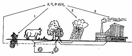 (2)图中的A物质代表尿素及动植物尸体,可被土壤中的微生物分解,形成B物质。B物质在土壤中,在 细菌的作用下形成C。C物质代表 。