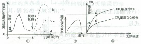 量。图②表示温度与酶的催化效率的关系。图③表示将植物放在不同浓度CO2环境条件下,