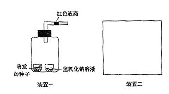 III.实验方法:按照装置一图将实验材料和用具装好。如想得到预期的实验结论,必须同时设计另一组实验装置即装置二,请指出应如何设计。(在方框内绘出装置二的图示并做好相应标注)