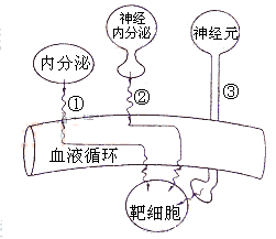 (10分)机体的稳态依赖神经调节、内分泌调节及免疫调节。调节中“信息分子”起重要作用。图示不同的细胞间信息传递的三种方式。分析以下不同调节过程中的信息分子和其传递方式: