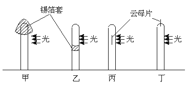 [解析] 甲尖端用锡箔纸套住,不会引起生长素分布不均,直立生长;乙下部遮光,尖端未遮住,在单侧光照射下,引起生长素分布不均,向光弯曲生长;丙下部中间插云母片,而尖端末插云母片,尖端在单侧光照射下,生长素在尖端横向运输,背光侧生长素浓度高,生长快,弯向光源生长;丁云母片插在尖端中间,单侧光照射下,尖端生长素横向运输受阻,不会引起生长素分布不均,直立生长。