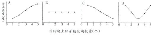 14.在5个相同的琼脂块上分别放置1-5个水稻胚芽鞘尖端,几小时后将这些琼脂块分别紧贴于5个切去尖端的胚芽鞘切面一侧,经暗培养后,测定胚芽鞘弯曲角度(如右图所示)。正确的结果是