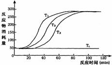 别表示在四种温度下反应物消耗量随时间的变化。