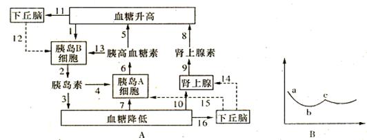 (1)若B图表示胰高血糖素的变化过程,则ab段胰高血糖素的浓度调节过程可表示为 (用序号和箭头表示) 。