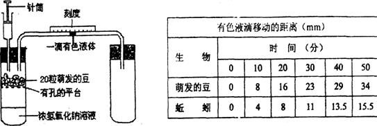 (二)下图装置可以用来测量萌发的种子、小动物所吸收的氧气量。分别以2 0粒萌发的种子 和4条蚯蚓为材料,每隔lO分钟记录一次有色液滴在刻度玻璃管上的读数如下表所示。