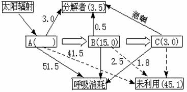 33.(每空2分,共14分)图为某湖泊生态系统能量流动的定量分析图解。图中A、B、C代表三个营养级,数字均为实际测得的能量数,单位为百万千焦。已知该生态系统受到的太阳辐射能为118872百万千焦,但其中118761百万千焦的能量未被利用。请回答:![]()