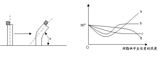 某研究小组探究避光条件下生长素浓度对燕麦胚芽鞘生长的影响。若干胚芽鞘去顶静置一段时间后,将含有不同浓度生长素的琼脂块分别放置在不同的去顶胚芽鞘一侧(如左下图),一段时间后测量并记录弯曲度(α)。右下图曲线中能正确表示其实验结果的是