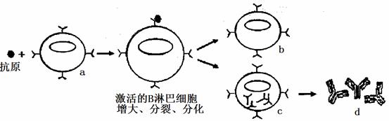 (2)若图中抗原再次进入人体内,不能被细胞a、b、c中 细胞特异性识别。