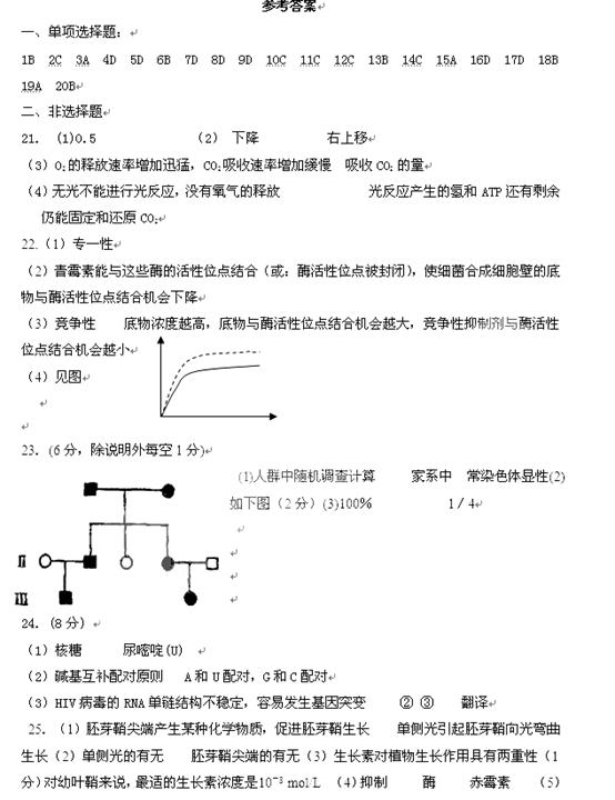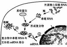 24.(8分)美国科学家安德鲁·法尔和克雷格·梅洛因为发现RNA干扰机制而获得2006年诺贝尔生理学或医学奖。他们的研究显示,外源微小双链RNA片段在酶的作用下分解为单链RNA并和某些蛋白形成复合物。这种复合物中的单链RNA与互补的mRNA结合,使mRNA被RNA酶裂解,使特定基因表达沉默。右图表示RNA干扰机制的部分过程。