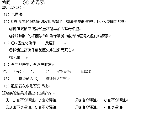 26.(10分)某一实验小组的同学,欲通过制备固定化酵母细胞进行葡萄糖溶液发酵实验,实验材料及用具齐全。