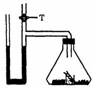 31、(20分)I(10分)右图是一种可测定种子呼吸作用的密闭系统装置,U形毛细玻璃管(带刻度)作为检压计。锥形瓶内放入一盛有20%KOH溶液的小烧杯,杯中插入一根滤纸折叠条,瓶底放人一些用蒸馏水浸泡过的滤纸圆片,再将经消毒并充分吸胀的小麦种子若干平铺在滤纸圆片上,加入适量蒸馏水,整个装置密封,放置到20℃恒温环境中,打开三通活塞(T),待U形管两侧液柱平衡后,关闭T,开始计时。过一段时间后,U形管中的液柱将怎样变化___________________________。U形管中液柱每小时移动的平均距离可代表__________的相对值,记为a,若用该装置继续测定单位质量种子呼吸时CO2释放量与O2消耗量的比值,可以如下操作: