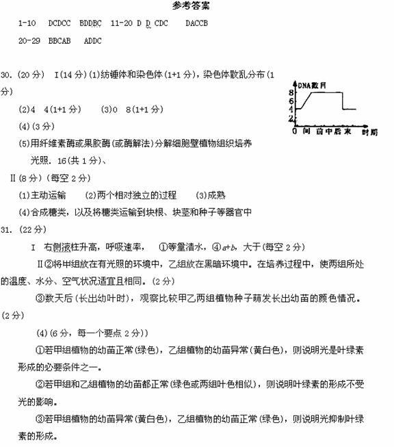 Ⅱ(10分)在植物绿色叶片中含有较多的叶绿素。人们已经知道,叶绿素的形成需要较高的温度,需要必需矿质元素。是否一定需要光照呢?某校生物学习小组的同学准备对这一问题进行探究。请你选择实验室里提供的材料,帮助他们设计出最佳的实验方法步骤,预测可能的实验结果,并分别得出相应的结论。