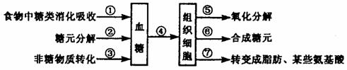 31.下图表示血糖的三个来源和去路,其中胰岛素影响的过程是 ( )